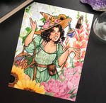 This item is a color print of an original piece I created for my Witchtober challenge in 2025 featuring a witch enchanting her flower garden.