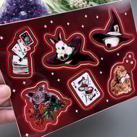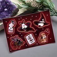 A 5x7 inch glossy vinyl sticker sheet designed for my Patreon sticker club. These are exclusive to my sticker club and won’t be reprinted. The stickers are around 2 - 2.75 inches.