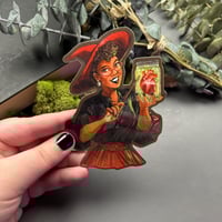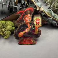 A vinyl sticker of a witch doing some canning of organs🫙❤️✨