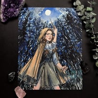 This item is a color print of an original piece I created for my Witchtober challenge in 2020 featuring a witch summoning the power of the moon to survive the storm-- though something seems to be lurking in the shadows.