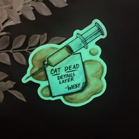 A glow-in-the-dark matte sticker of an imaginary note mentioned by Dr. Herbert West saying “Cat dead. Details later. —West”.