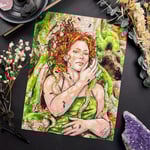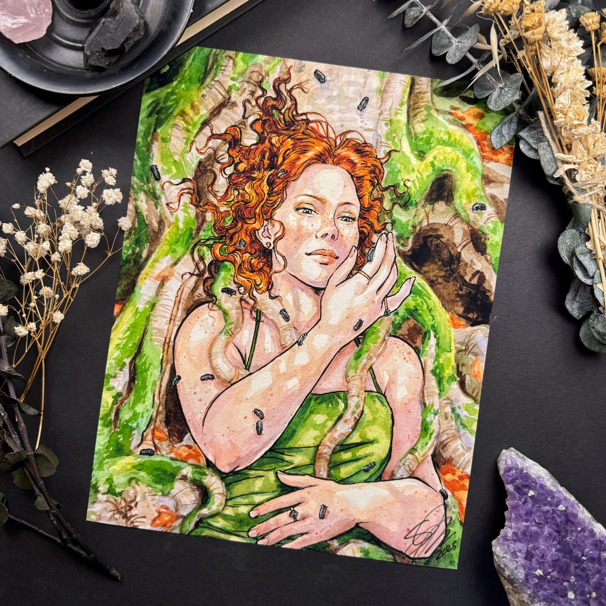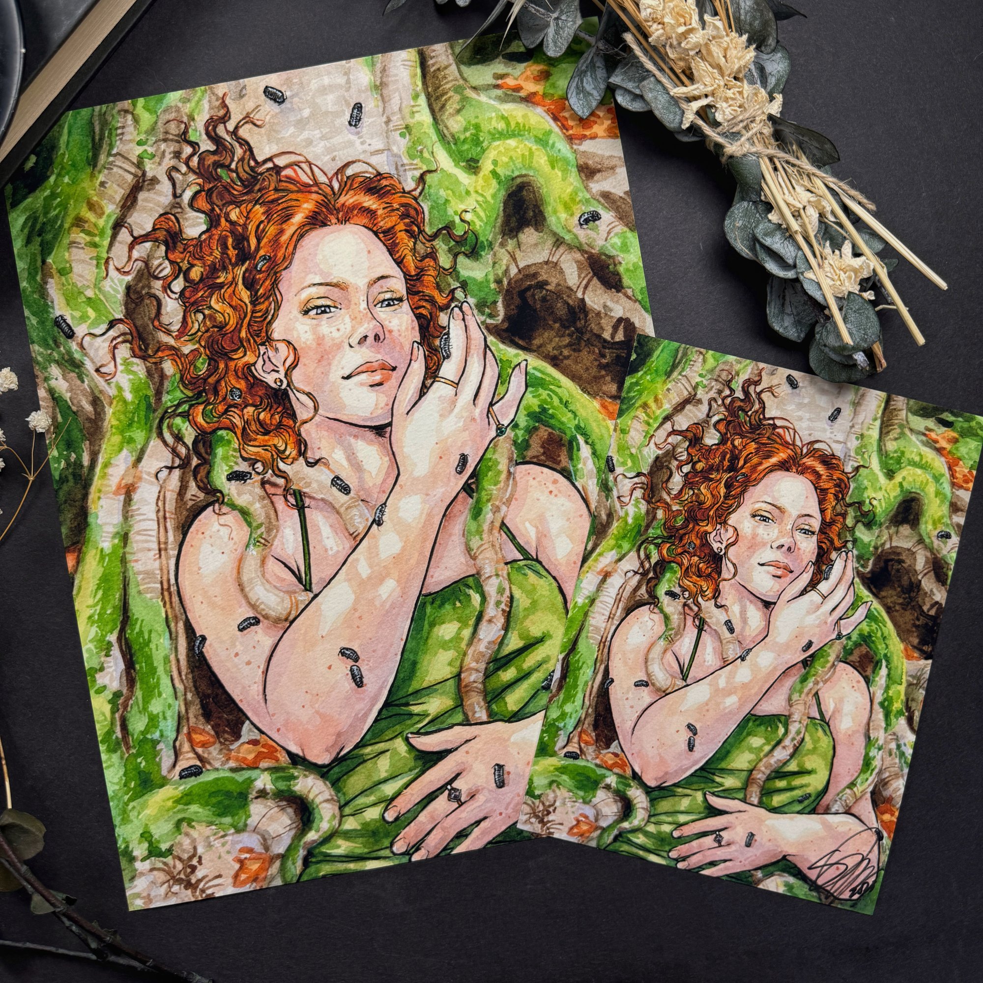 This item is a color print of an original piece I created for my Witchtober challenge in 2025 featuring a witch in the roots of a tree with little isopod familiars.